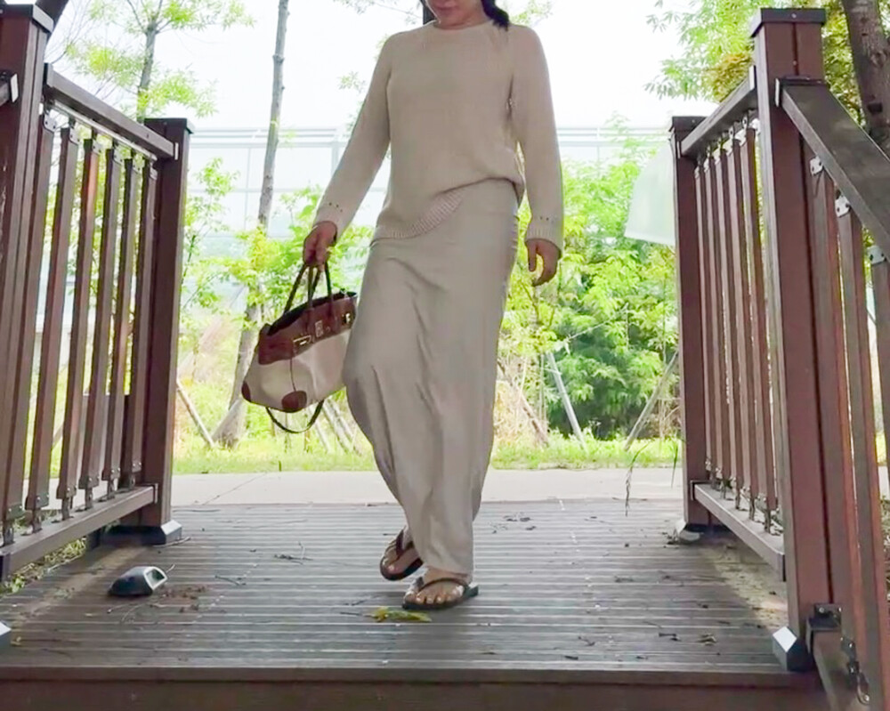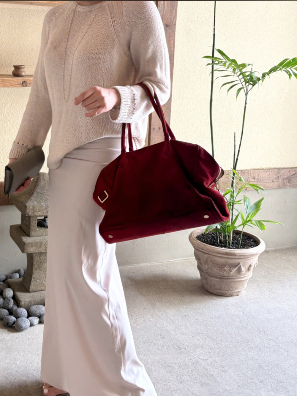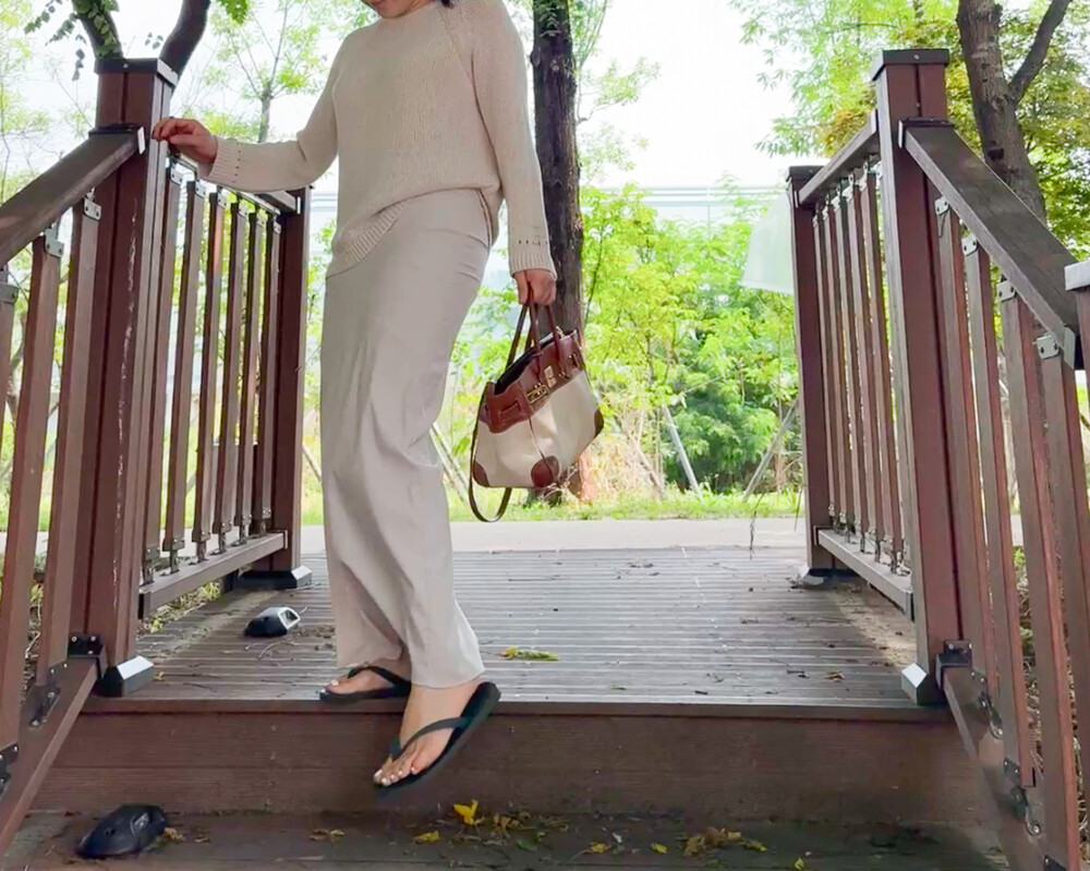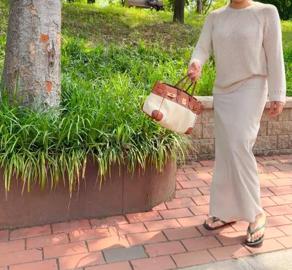 빛에 따라 달라지는 컬러감이 특징으로, 조명 아래서는 따뜻한 베이지 톤, 자연광에서는 부드러운 연그레이 톤으로 표현되어 뉴트럴 컬러의 상의와 매치하면 한층 고급스러운 무드를 연출할 수 있습니다.