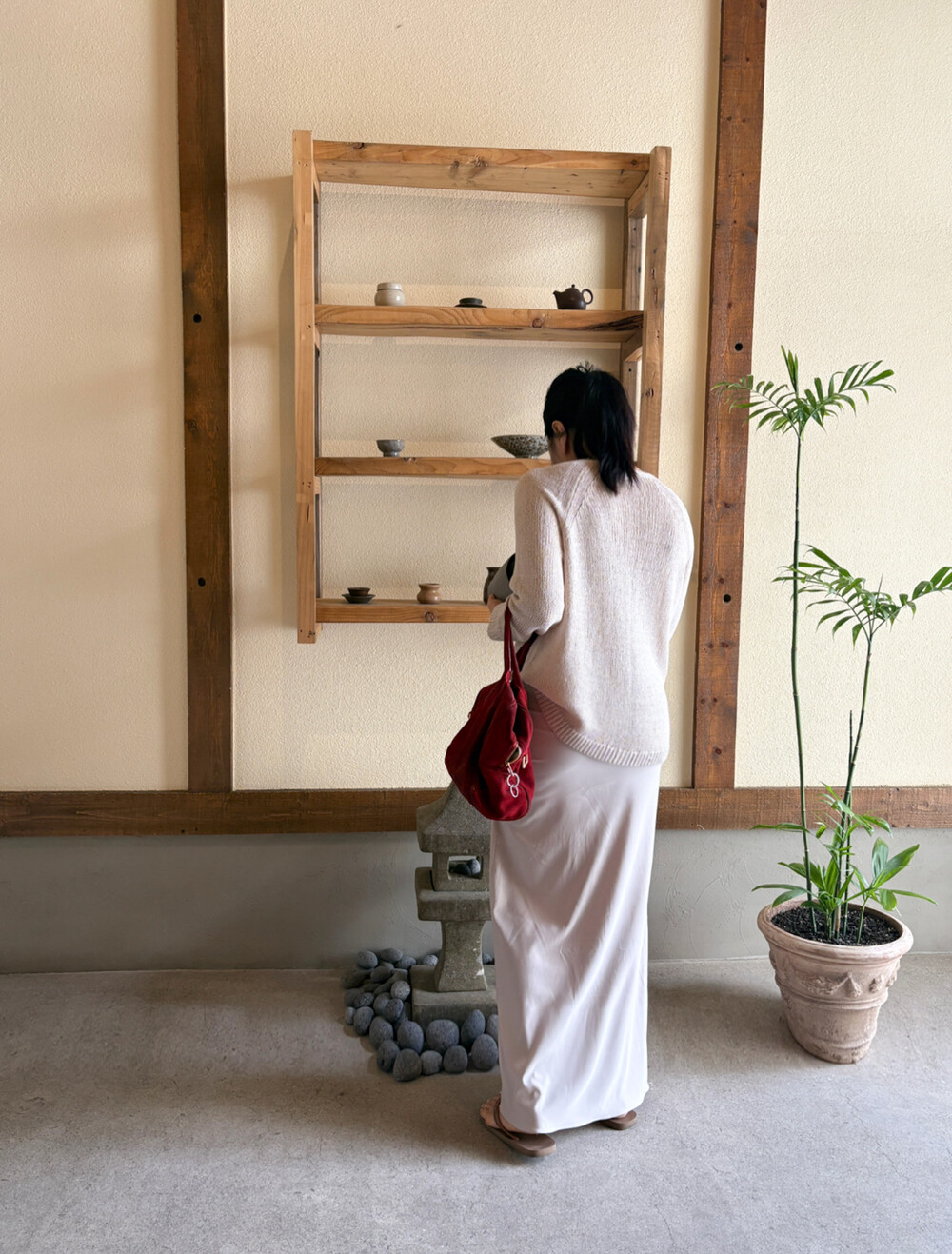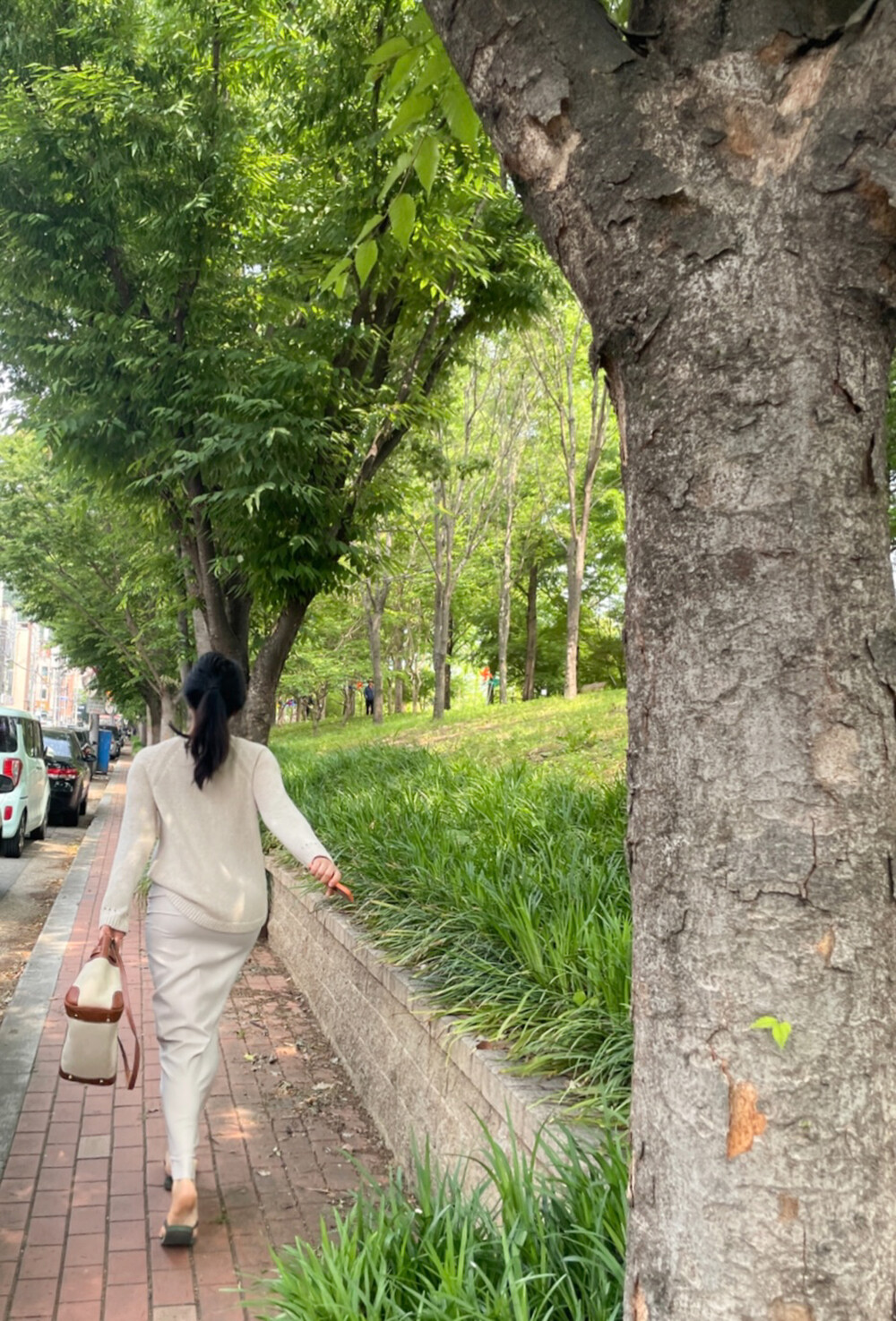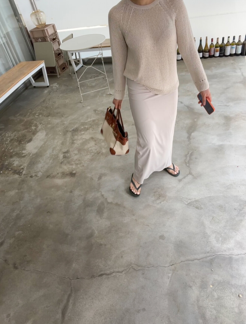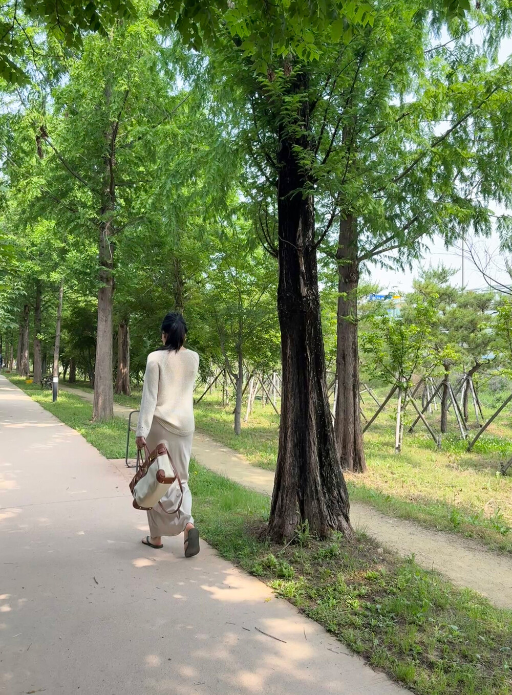 빛에 따라 달라지는 컬러감이 특징으로, 조명 아래서는 따뜻한 베이지 톤, 자연광에서는 부드러운 연그레이 톤으로 표현되어 뉴트럴 컬러의 상의와 매치하면 한층 고급스러운 무드를 연출할 수 있습니다.