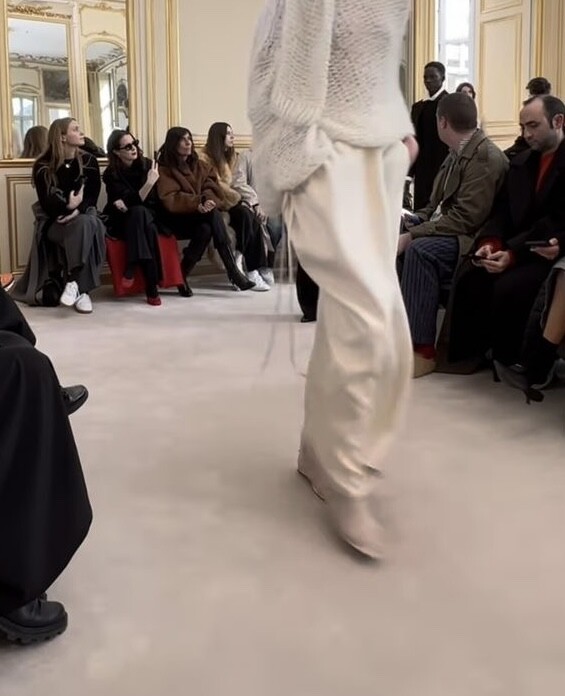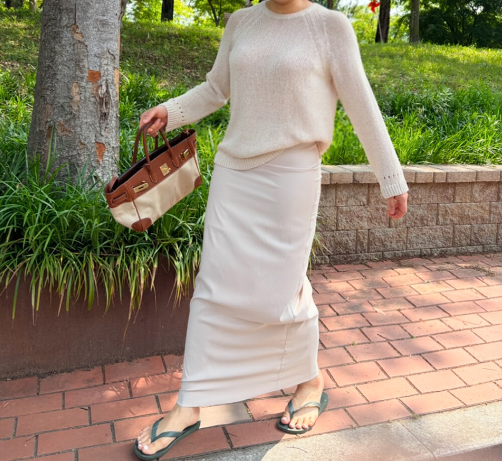 자연스럽게 흐르는 롱한 실루엣과 드레시한 무드, 힙을 살짝 감싸고 아래로는 여유롭게 퍼지는 핏으로