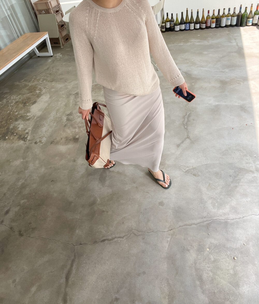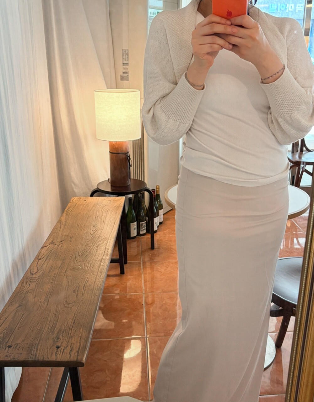 은은한 광택감과 베이지 빛이 감도는 오묘한 그레이 컬러가 매력적인 맥시 롱 스커트입니다.