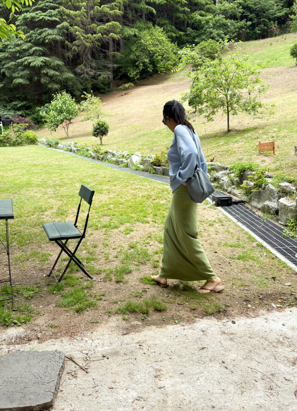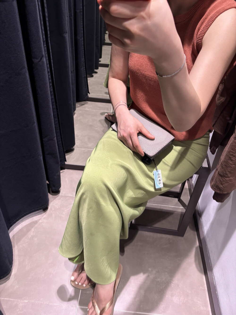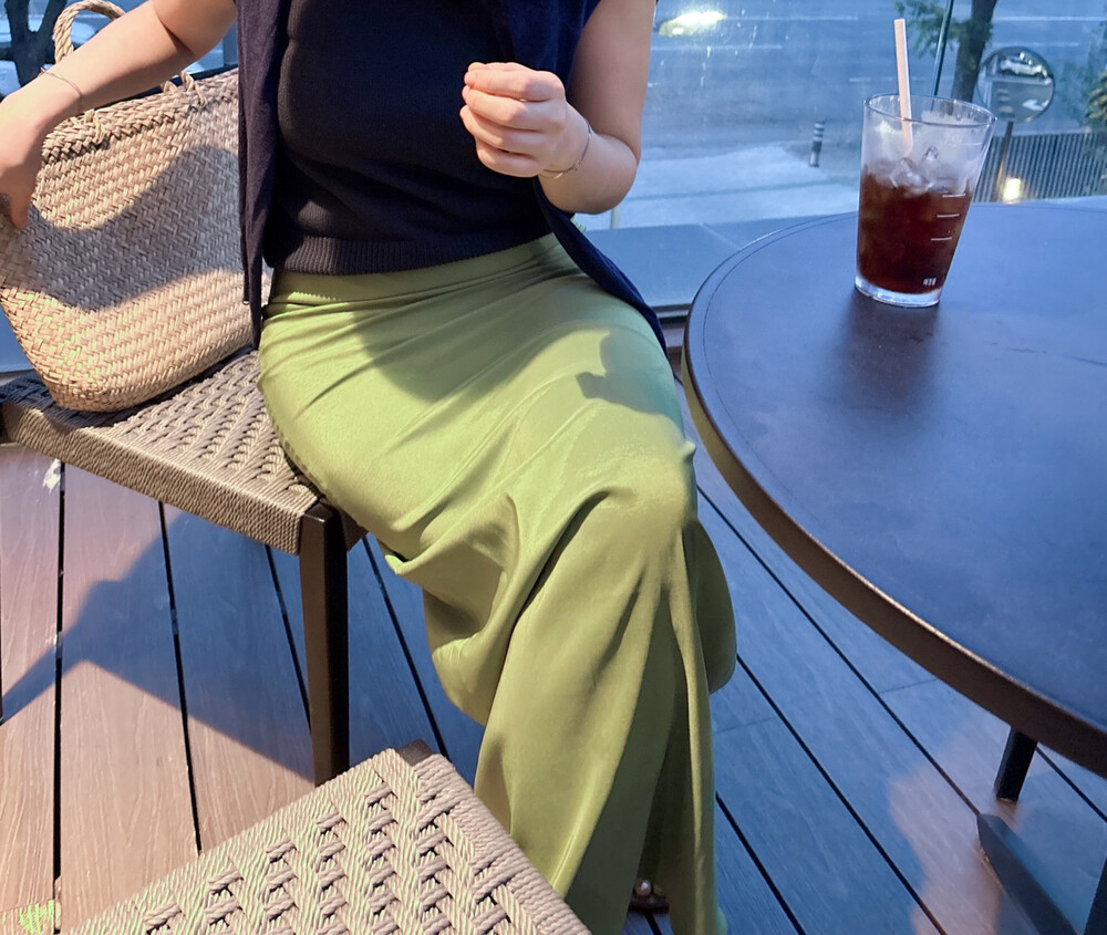 은은한 광택감과 차분하게 톤다운된 올리브 컬러가 고급스러운 분위기를 더해주는 맥시 롱 스커트입니다.