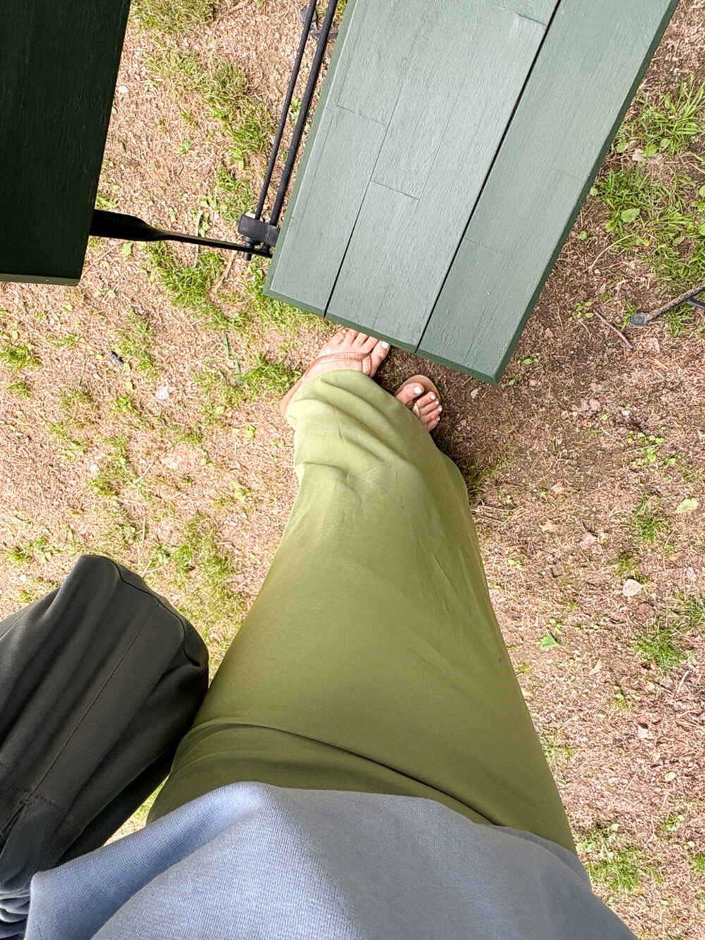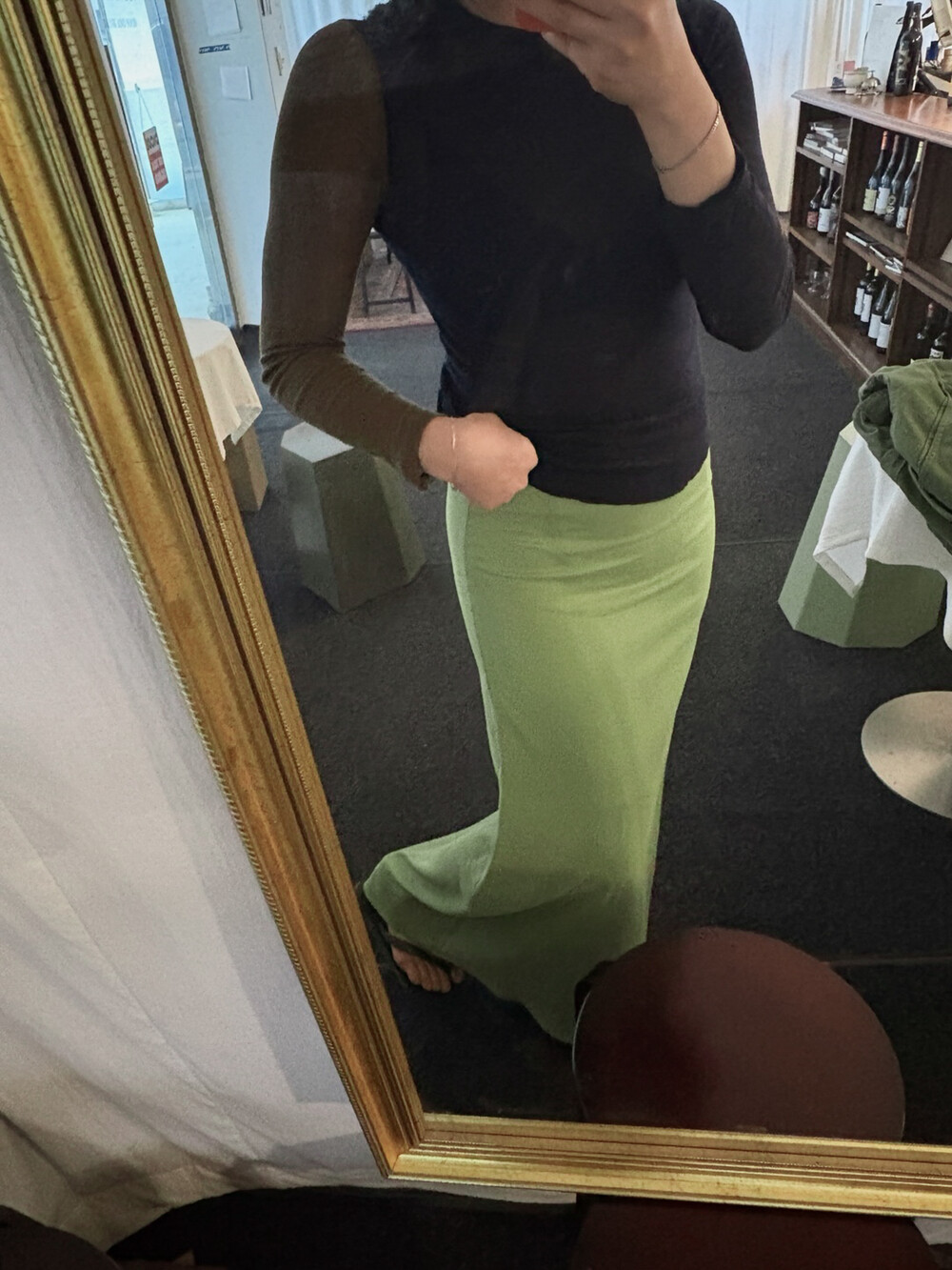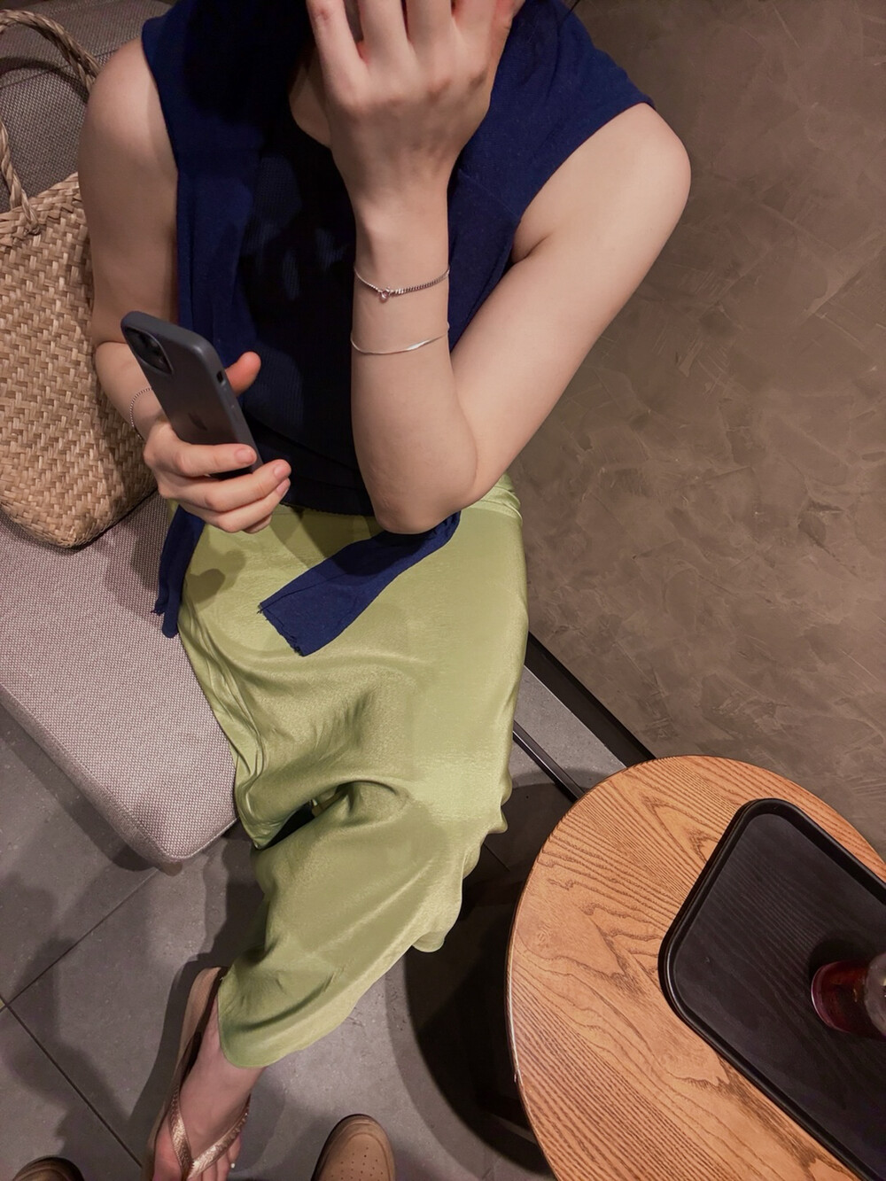 은은한 광택감과 차분하게 톤다운된 올리브 컬러가 고급스러운 분위기를 더해주는 맥시 롱 스커트입니다.